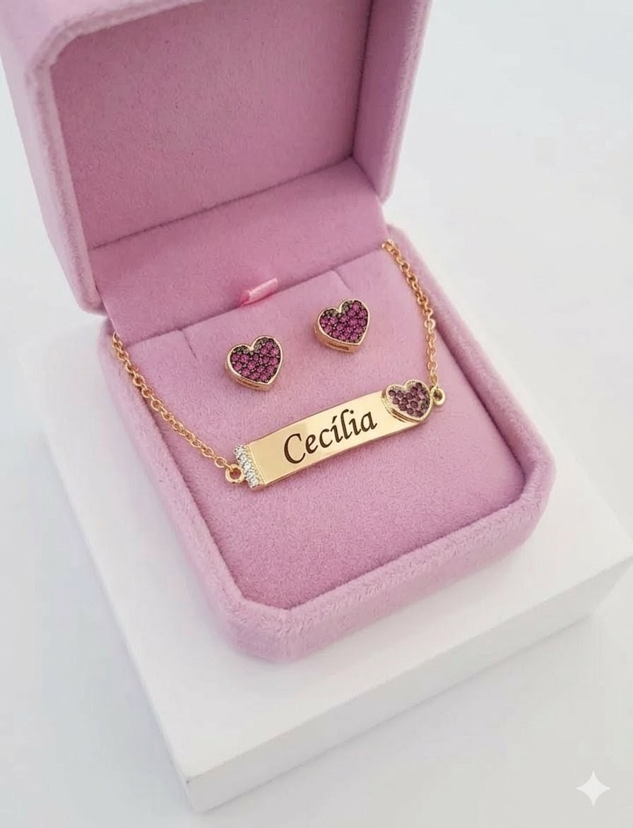 Conjunto infantil personalizada coração cravejado zircônias rubi